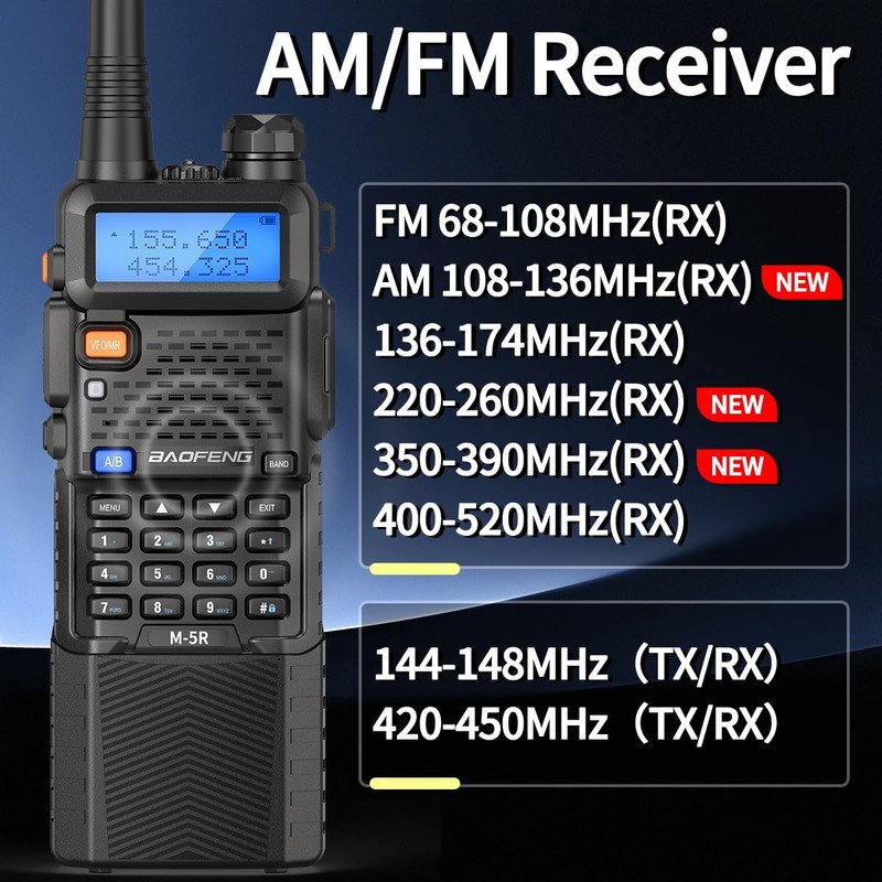 - Upgraded of Baofeng UV-5R: FCC ID:2AJGM-5RX.M-5R is upgrade of UV-5R, supports VHF/UHF,220MHz band for versatile use across multiple applications. FM,Copy Frequency, 128 Channels,DTMF,3800 mAh battery, LED Flashlight.