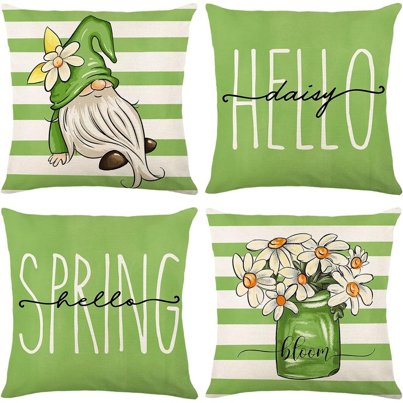 BAOKU Decorative Cushion Cover, 45 x 45 cm Set of 4 green daisy Flowers Pattern Linen Pillowcase 18 x 18 inches for Sofa Couch Bed Home Garden Outdoor Spring Decor