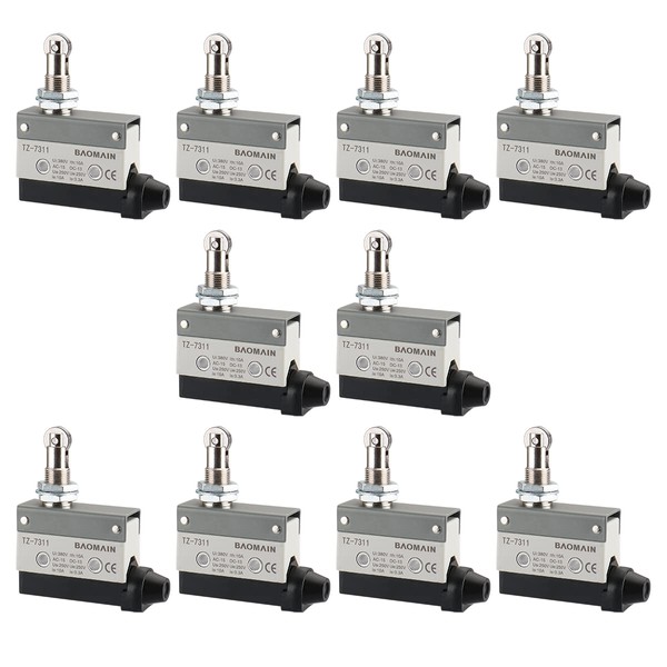 BAOMAIN Limit Switch TZ-7311, Panel Mount Roller Plunger Actuator, 1NO+1NC SPDT, 10A 250VAC Heavy Duty Horizontal Micro Switch for Automation, IP65 Waterproof, 10-Pack