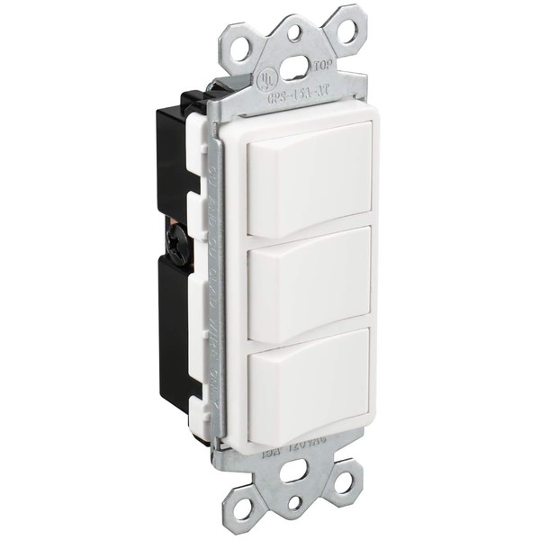 Baomain Triple Rocker Light Switch, 15A 120V Single Pole, 3 Individual Switches Grounding, Combination Wall Switch White, UL & CUL Certified