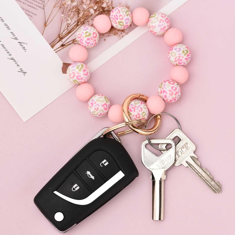 BAOSIWA Silicone Beaded Keychain Wristlet Key Ring Bracelet Cute Car Key Chain Holder with 2 Keyrings for Women Girls Pink