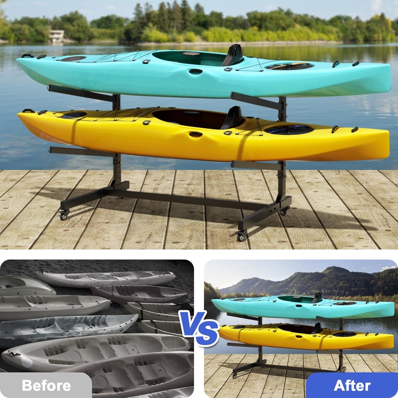 - 【Multi-Storage Space】With 2 levels of storage, the kayak stand provides plenty of room to store your kayaks, canoe, paddleboards, sup board and surfboards, or other water sports equipment. Keep your gear organized and easily accessible