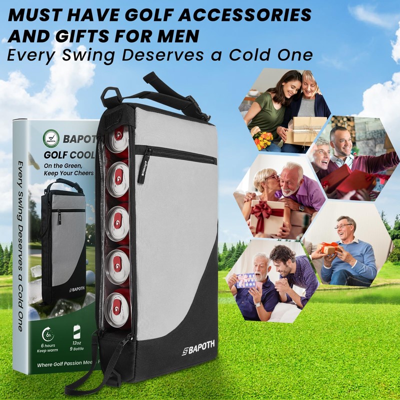 BAPOTH Golf Cooler Bag with 4 Ice Pack for 6 Hours, Large Capacity Golf Cooler Bag Hold 9-Can 12oz, 6-Can 16oz, 2 Bottle 750ml, Detachable Shoulder Strap for GolfCourse & Outdoor Parties