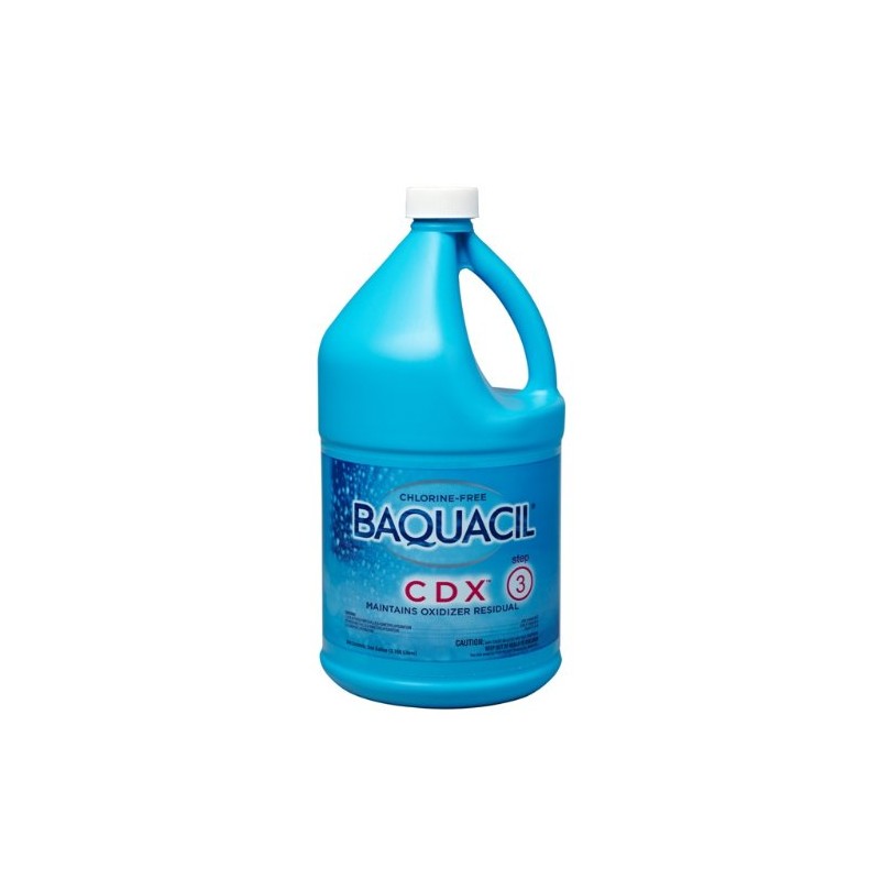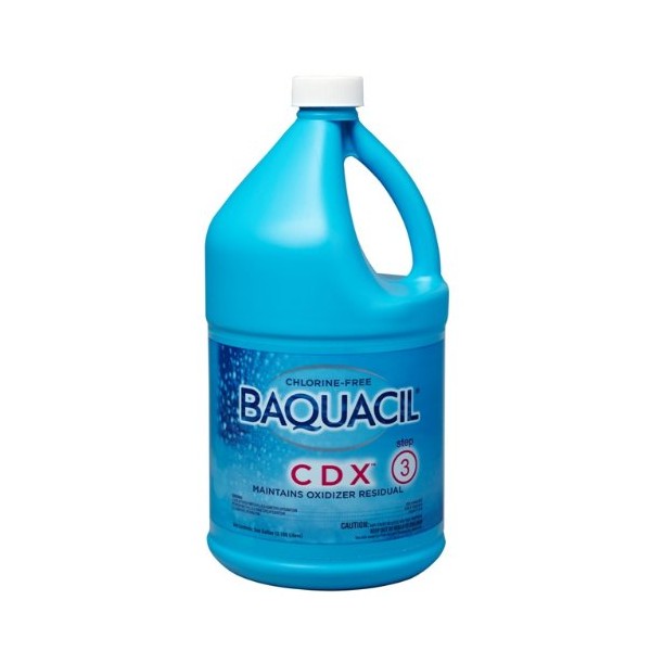 - USE: Step 3 in the 3-step BAQUACIL CDX system for swimming pools; Designed to be used once per week; Initial dose is 1 pint for 10,000 gallons of pool water, which you poor directly into the pool skimmer