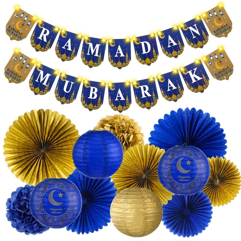 Baquler Ramadan Mubarak Decorations Set Eid Mubarak Hanging Banner Paper Lantern Blue Gold Paper Fan Tissue Pom Pom with Led String Light Decor for Home Eid Al-Fitr Muslim Kareem Party Supplies