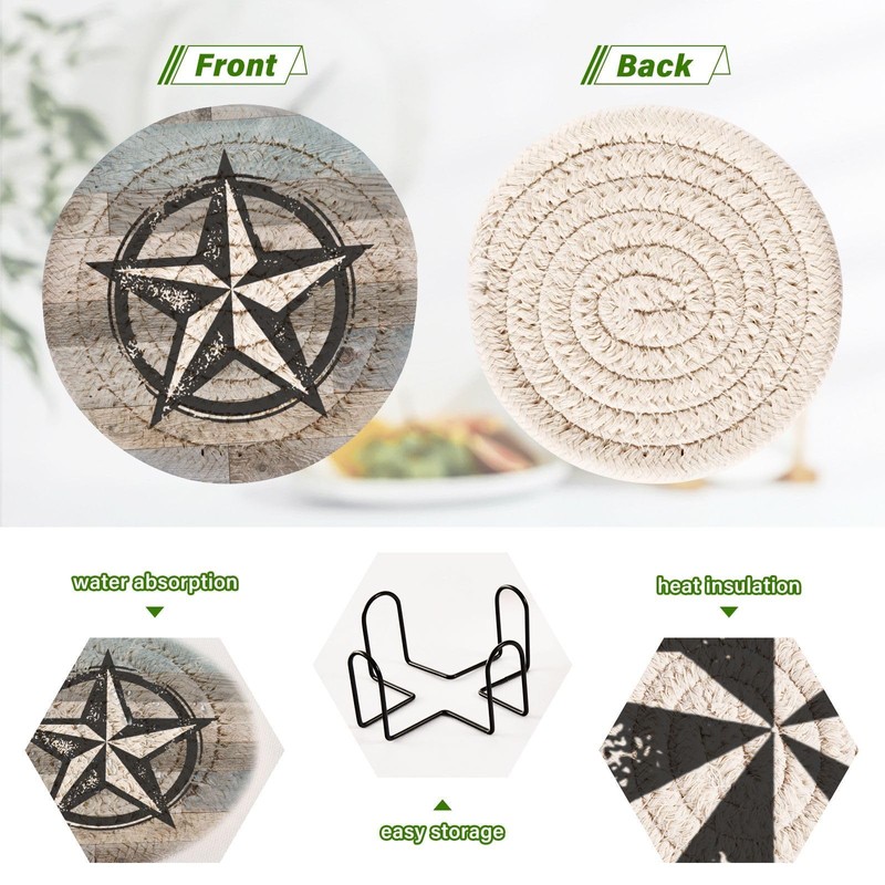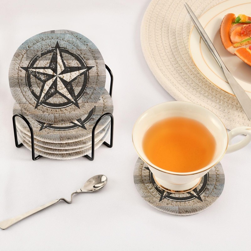 Bar Coaster for Drinks, Coil Woven Coasters Holder Pad 3.94 in Diameter for Mugs Thickness of 0.24 in with Metal Rack Print Texas Star On Wood