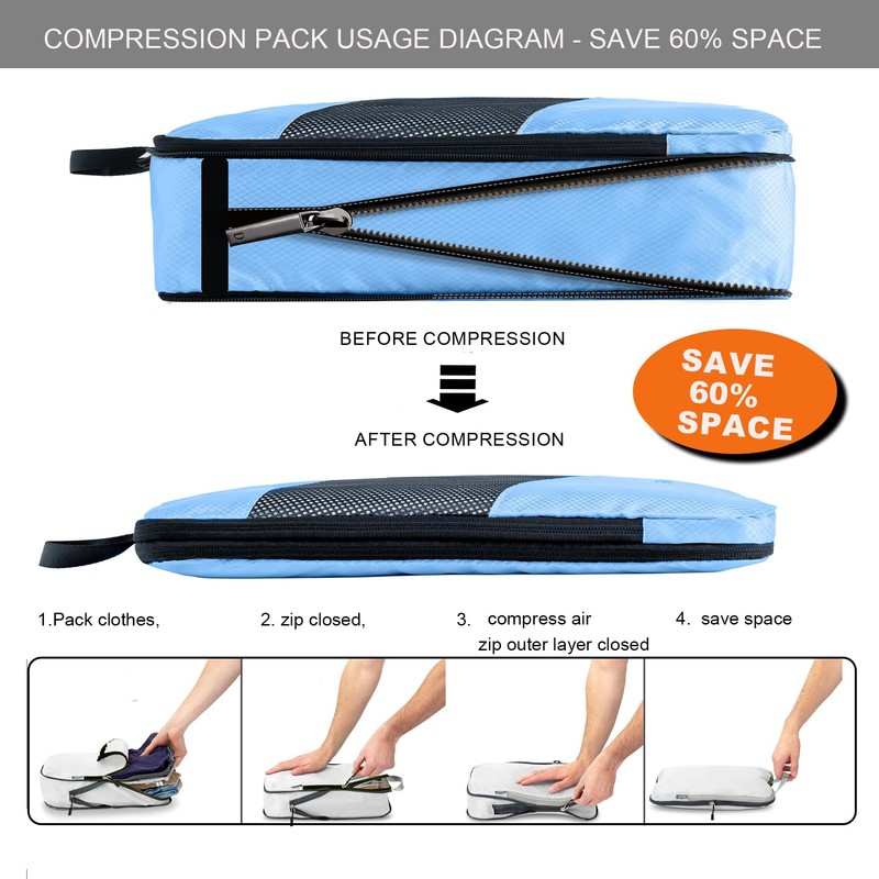 - Maximize Luggage Space-Our two-zipper system packing cube can compress clothes and save up to 50% space, allowing you to fit more into your suitcase than you ever thought possible. Steps:Firstly, fold your clothes and flatten them; Secondly, pack clothes in cubes and zip the normal zipper. Finally, zip up the extra zipper to compress the packing cubes.