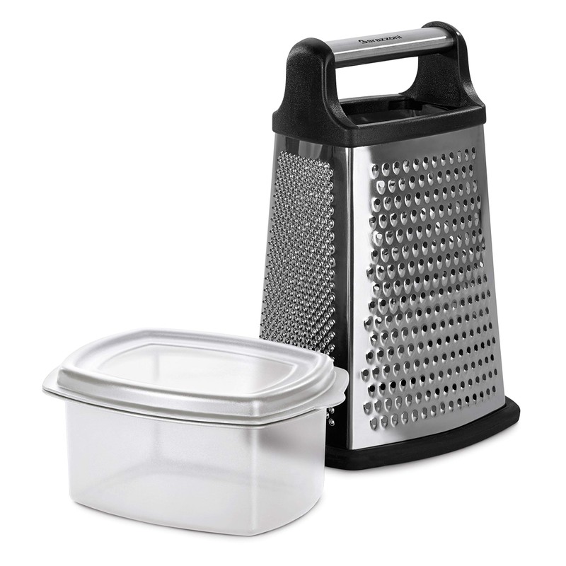 - Grater with 4 different blades, one for each side, for cutting and grating fine, medium and coarse; handle and frame made of black plastic.