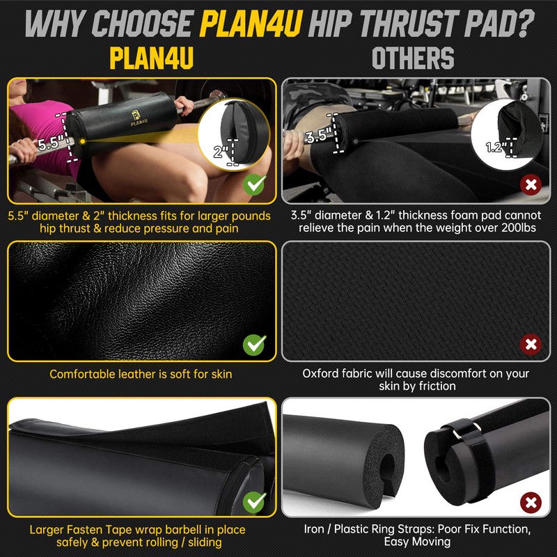 - 🏋UPGRADED 2 inches Ultra-thick Leather Foam Pad for Professional Bench Powerlifting: Plan4U bench Press Pad has a thickened foam pad and soft leather surface, which is suitable for diameters of 1-1.1” (25-28mm) Olympic barbell and 1-1.26” (25-32mm) Smith machine bar and ideal size for most barbells to train your chest muscles, triceps, hip muscles and hamstrings.Plan4U bench press foam pad greatly relieve pressure and pain points on your hips or pubis caused by heavy pounds.