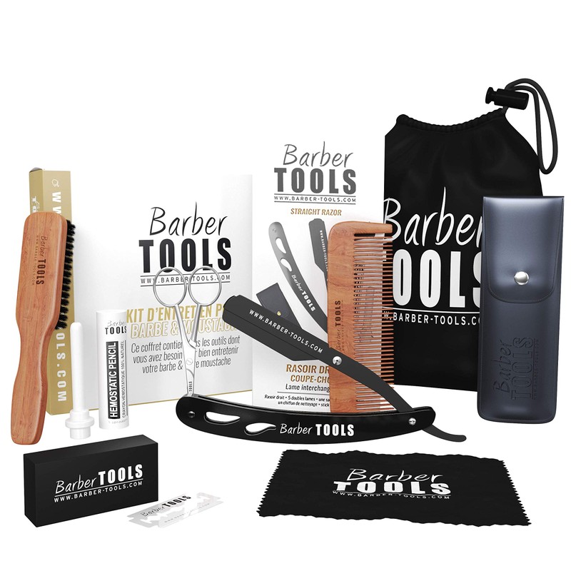 • ➽ This kit includes: beard comb + beard brush 100% wild boar bristles + precision scissors + alum stone + straight razor with replaceable blade + 5 double blades + shaving cloth + bag