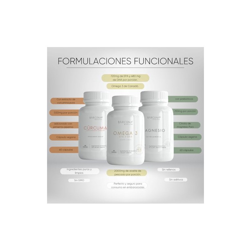 BARCENA HEALTH - Kit Funcional Funtional Kit Crcuma Pura Omega 3 (DHA y EPA) Glicinato de Magnesio Ingredientes Limpios, Gluten Free, Sugar Free