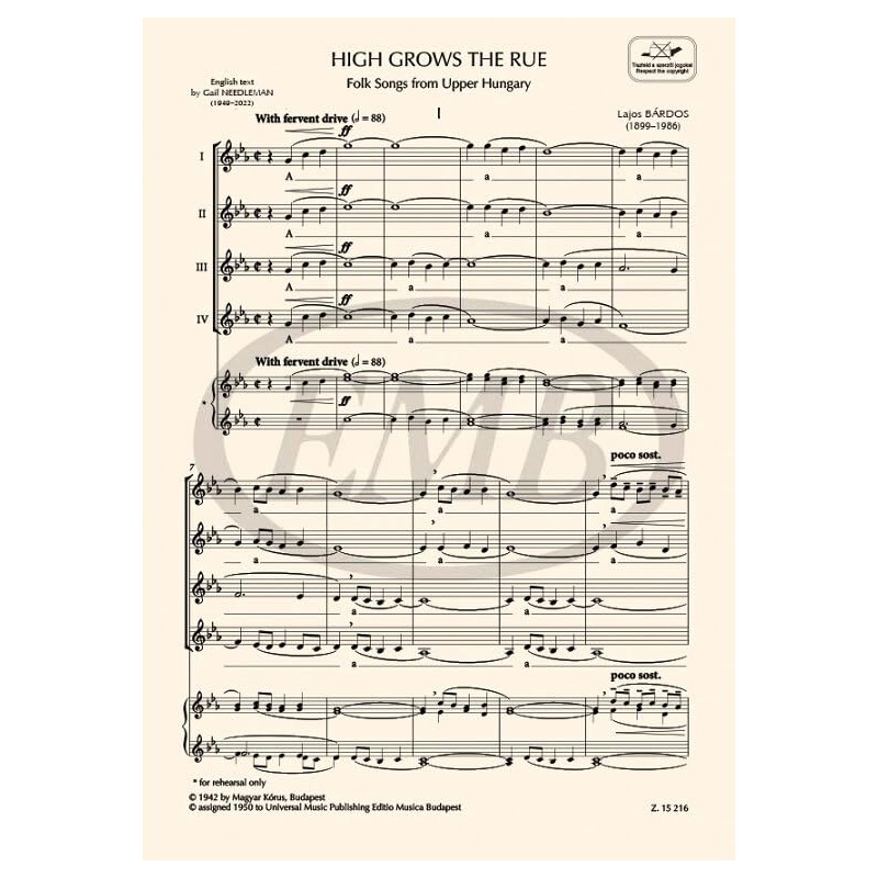Bárdos Lajos: High Grows the Rue [Magos a rutafa] / for upper voices / choral sheets / Translated by Needleman, Gail