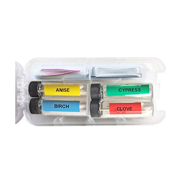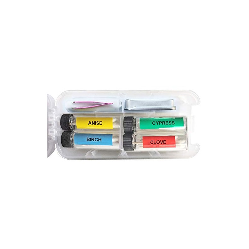 This is a small travel kit for scent work training. It contains one hide tin, one tweezer, four color coded labeled glass vials containing scented swabs in birch, anise, clove, cypress, and assorted fasteners or scent vessels (examples: glue dots, evidence vial, shrink tubing, tacky putty; depending on availability). Tin measures 2 in. x 1 in. x 3/8 in. Vials are 2 dram clear glass, six swabs in each vial, overall box measures 2.75 in. x 6 in. x 1.25 in.