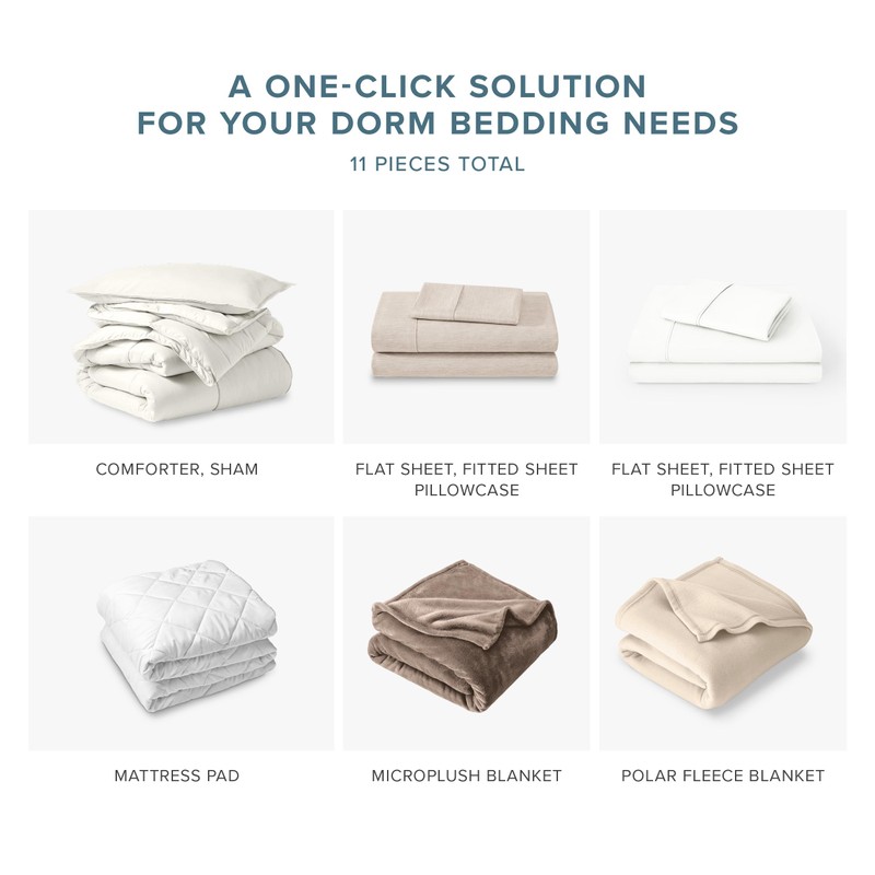 - DORM READY BUNDLE – All-in-One College Bedding Set for Dorm Room. Start the semester strong with the DORM READY Bundle—your complete bedding solution for college life. This 11 or 14-piece dorm bedding set includes everything you need to check off your dorm bedding checklist. From a cozy comforter to TWO full sheet sets, blankets, and a plush mattress pad, it's the ultimate college dorm room bedding starter pack. Move-in day? Consider it handled.