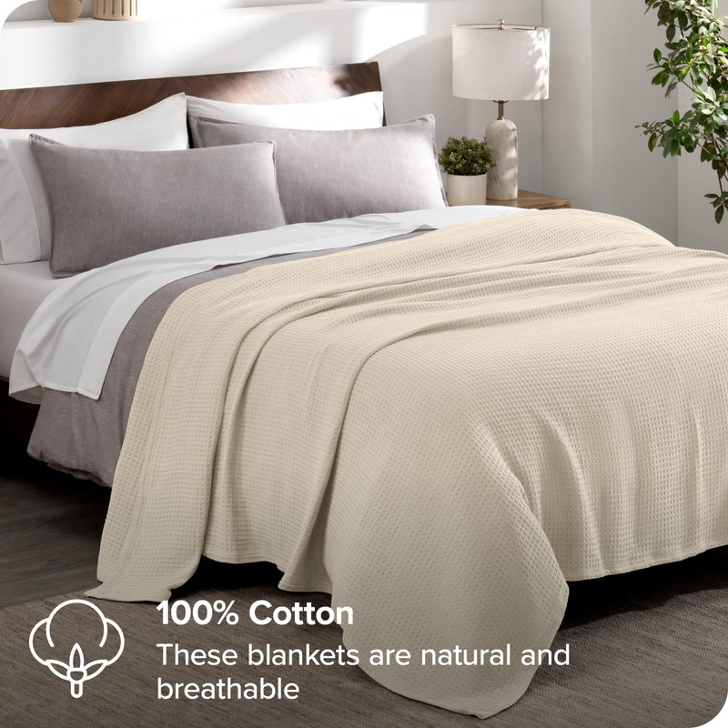 Bare Home Oyster Waffle Blanket, Throw Size 44Wx66L, 100% Cotton, Soft & Breathable Blanket for All Seasons, Lightweight Blanket, Perfect for Layering Bed, Sofa & Couch (Throw/Travel, Oyster)