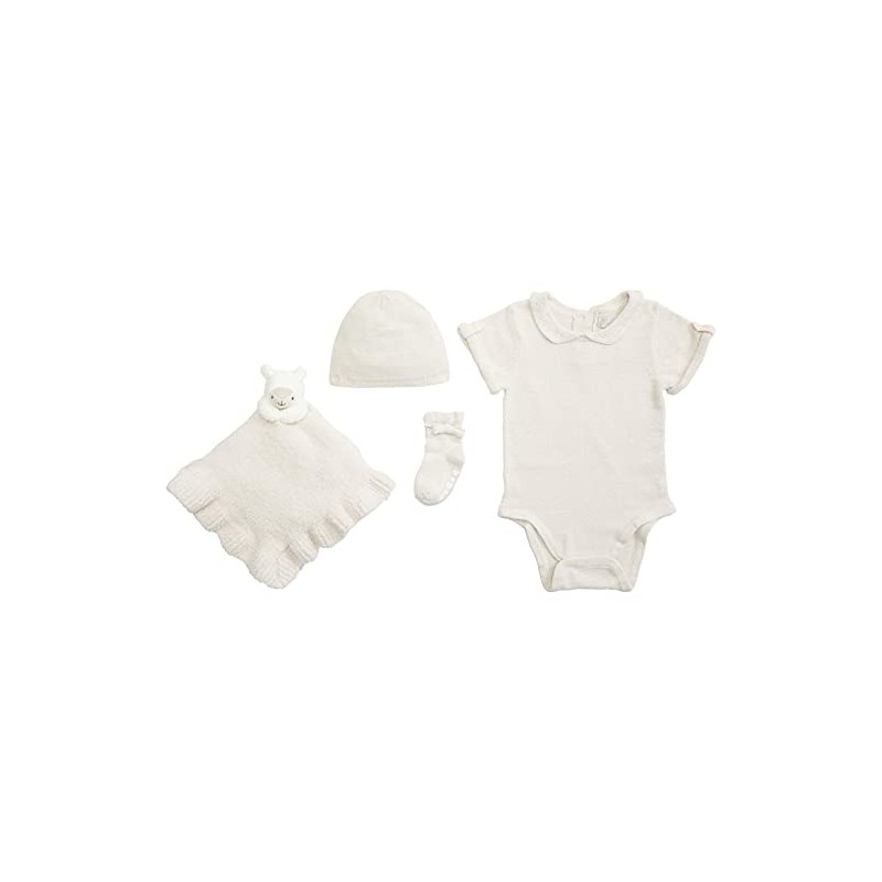 - COMFORTABLE INFANT OUTFIT: Perfect for gift giving, this four-piece baby bundle a dream to give or receive. Bundle includes eyelet beanie, Peter Pan collar onesie with button detail on sleeve, coordinating Blanket Buddie, and pair of ruffled socks with heart pattern grip on sole. Comes in a branded gift box, perfect for gifting. Each piece of fabric is made of 71% Nylon, 29% Viscose.