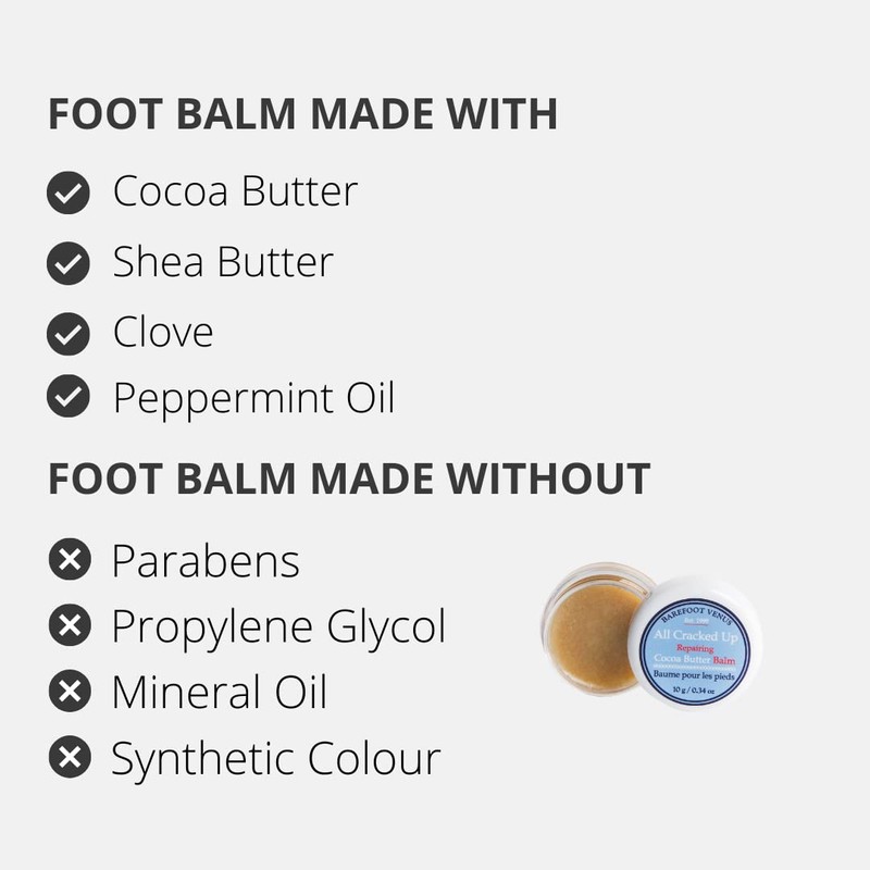 - The Foot Balm Includes Cocoa Butter, Shea Butter, Clove and Peppermint Oil