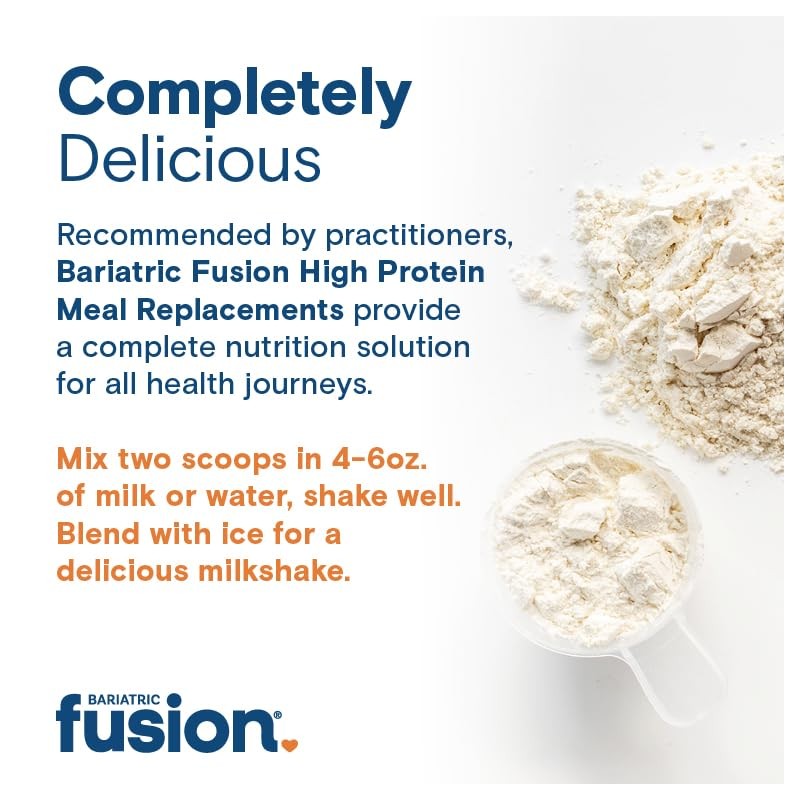 • The suggested use is to combine 2 scoops of Bariatric Fusion High Protein Meal Replacement with 4-6 fl. oz of water, milk, or your favorite beverage and thoroughly mix in a blender or shaker. For a milkshake-like consistency, add 4-6 ice cubes., blend until smooth.