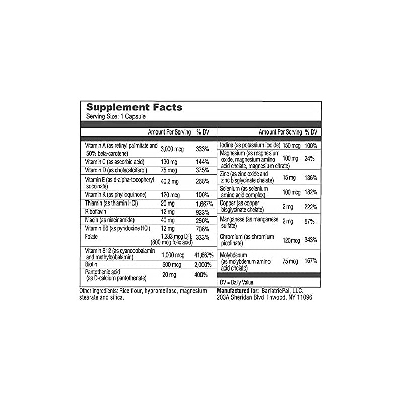 - BariatricPal Multivitamin ONE was designed and developed by a team of the world's leading Bariatric medical professionals. The fast-dissolving small veggie capsules are very easy to swallow and use. You only need one a day to meet recommendations for bariatric patients.