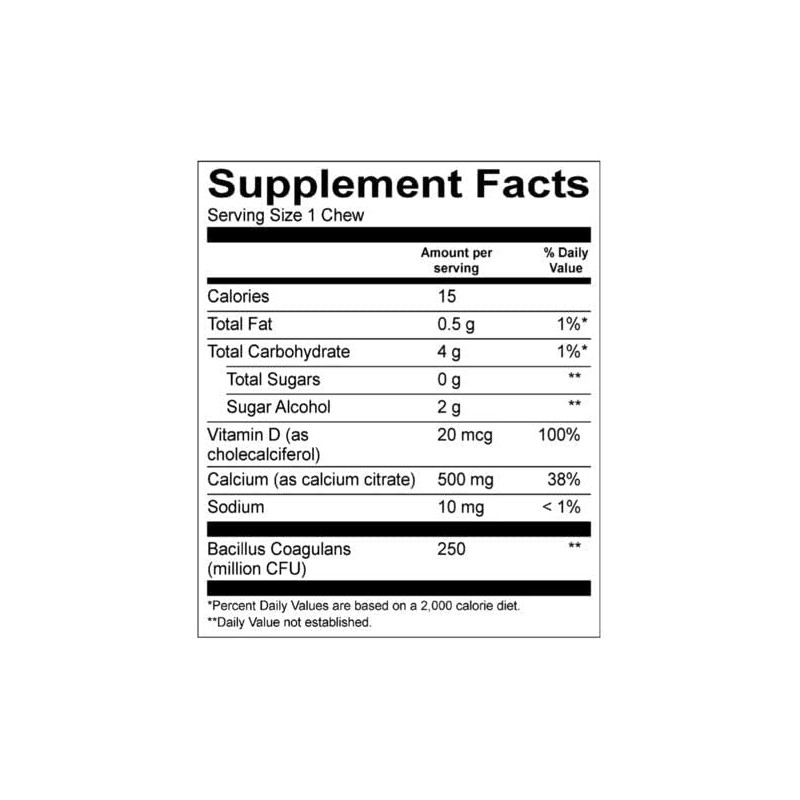 - Each calcium citrate soft chew has 15 calories and no sugar or fat. Each chew has 500 mg of calcium citrate, 800 IU of vitamin D, and 250 million CFU of probiotics.