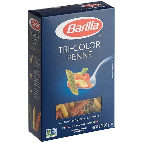 Barilla 12 oz. Tri-Color Penne Rigate Pasta (select quantity below) - 16/Case 12 oz. Tri-Color Penne Rigate