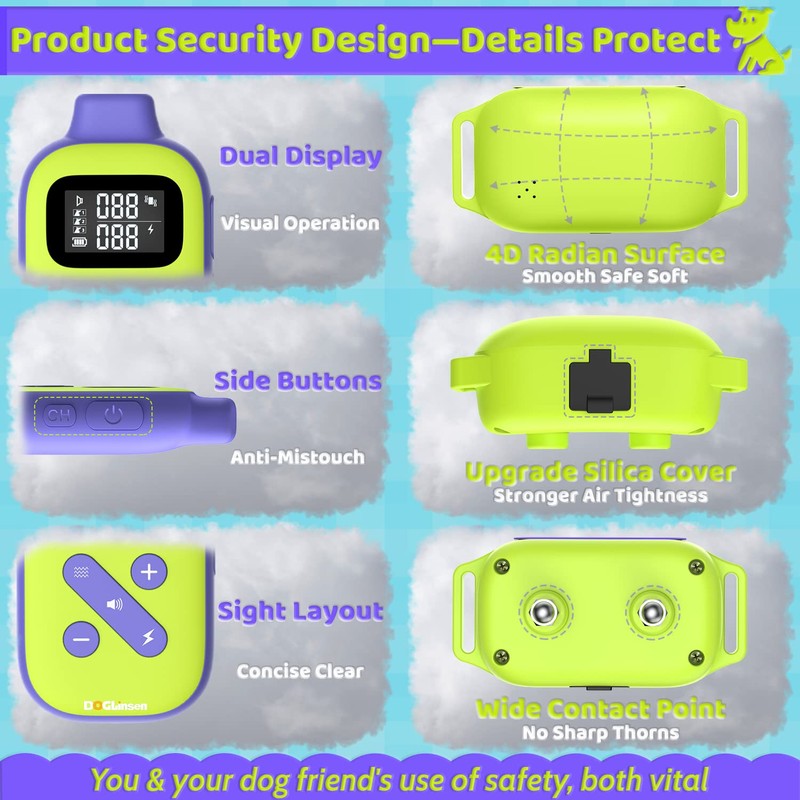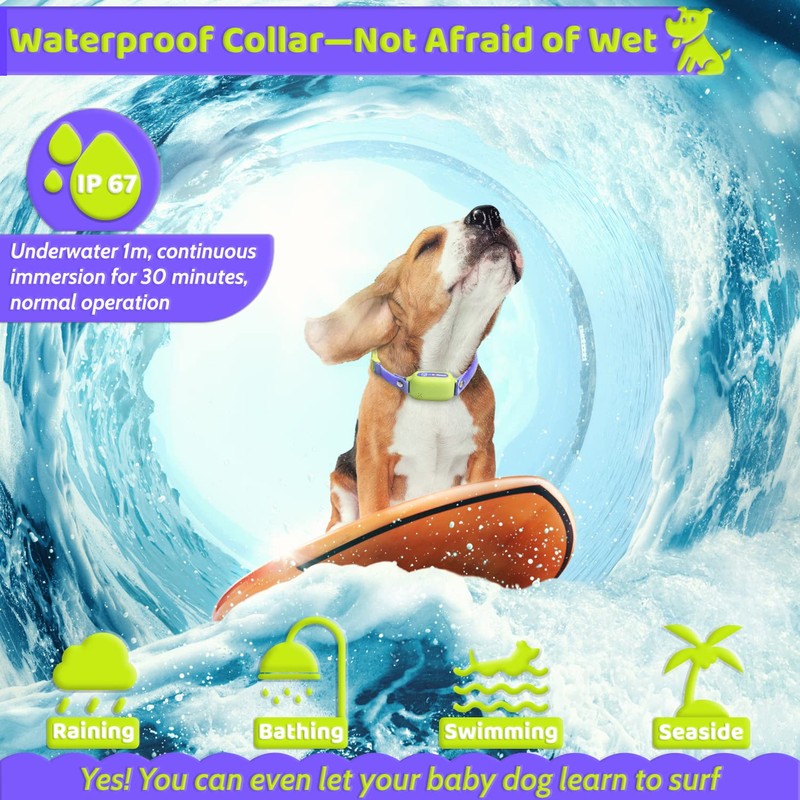 - 🥇【PERFORMANCE PARAMETERS】Thanks to the hidden antenna design, our bark and shock collar combo have 3300 ft remote range. IP7 waterproof and dustproof, still work well in wet environments (pool, rain, bath, beach), and dusty situations (fields, deserts, sandstorms). One button can switch training up to 3 dogs. Receiver size L(2.76")W(1.38")H(1.18"), 0.11lbs, lightweight and stress-free for your baby dog.