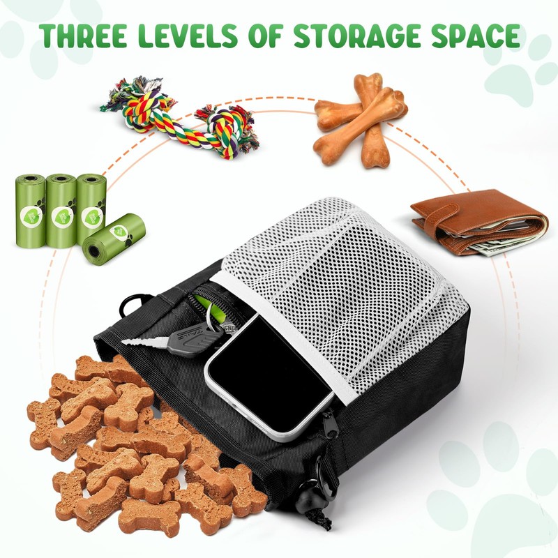 - 【Multiple Storage Pockets】The dog treat training pouch is designed to easily carry snacks, pet toys, training tools and personal items. Designed with four storage compartments, you can conveniently store your dog's favorite snacks, poop bags, toys, and personal items separately.