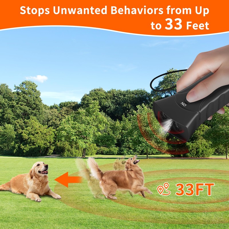 - 🐕【DUAL ULTRASONIC SPEAKERS WITH LONG RANGE】This dog training and bark control device is equipped with dual ultrasonic speakers, covering up to 33 feet to deter aggressive dogs. Its compact and portable design makes it perfect for both indoor and outdoor use, allowing you to train or keep dogs at bay anytime. The combined high-frequency sound and flashlight increase its deterrent effect, especially in low-light or nighttime conditions.