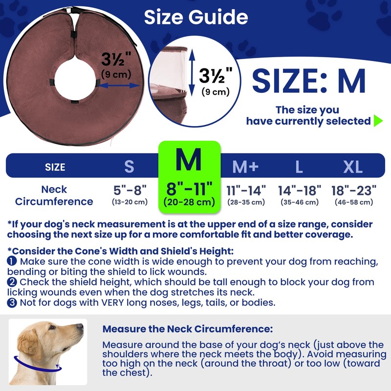 - Choose the Right Size: When selecting a size, consider not only your dog's neck circumference but also the cone's width and the shield's height to ensure full coverage of the wound. The dog cone alternative should extend past your dog's mouth to prevent them from biting the guard or reaching the wound. This inflatable dog cone may not be suitable for dogs with longer noses, legs, or tails, or more flexible breeds (such as Greyhounds)