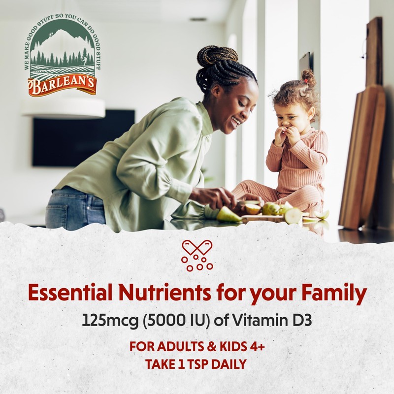 - IMMUNE HEALTH: Help support immunity and healthy energy levels with Vitamin D supplements. Barlean's Seriously Delicious Vitamin D3 has 125 mcg D3 per teaspoon serving for cognitive health, focus, and balanced mood. 30 servings of 5000 UI per container, sugar-free, dairy-free, non-GMO and gluten-free
