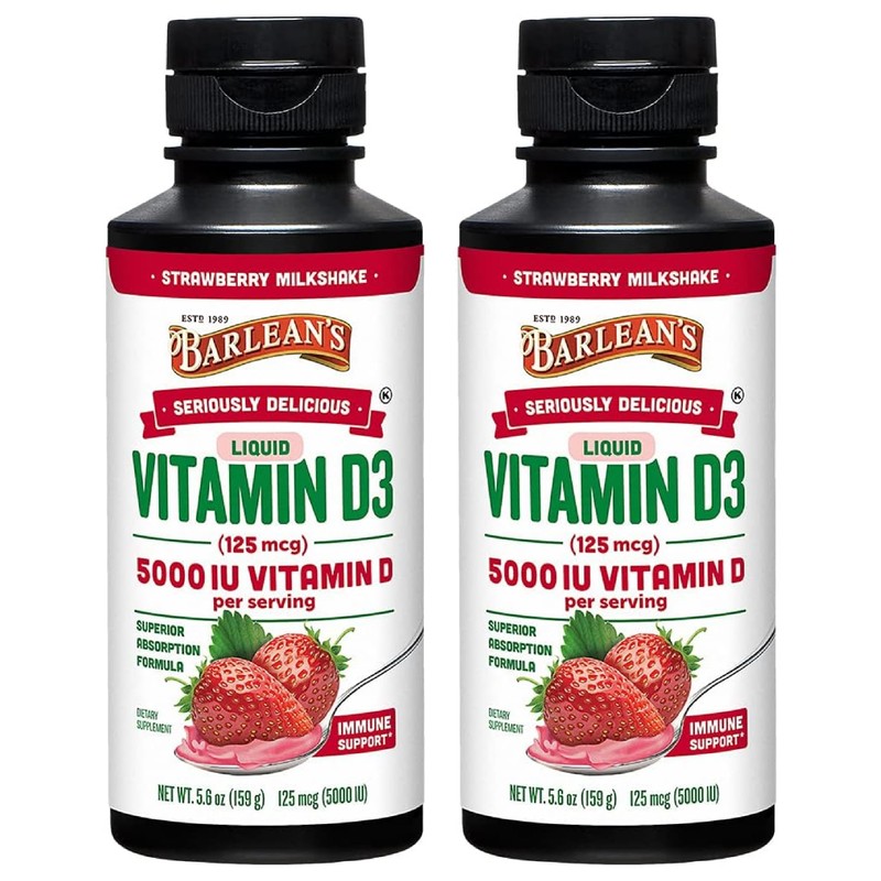 Barlean's Barlean's Pack of 2 Liquid Vitamin D Supplement for Kids and Adults with 5000 IU D3, Strawberry Milkshake Flavored Sugar Free Vitamins for Children, 5.6 oz Each