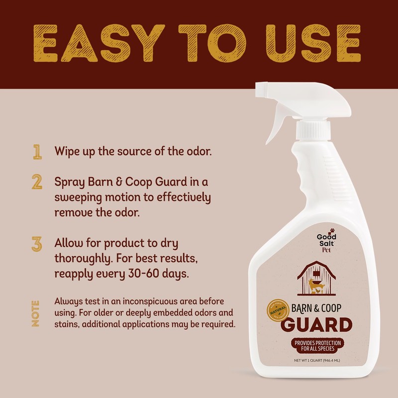 Barn & Coop Guard revolutionizes coop odor control. This Odor eliminator blend formula creates a barrier against odor-causing microbes, ensuring a fresh environment for up to 60 days. Unlike typical odor eliminators for houses, it's specifically designed for barn and coop spaces. The easy-to-use spray application makes maintaining a clean-smelling barn or coop effortless. Enjoy long-lasting freshness without harsh chemicals or artificial fragrances.