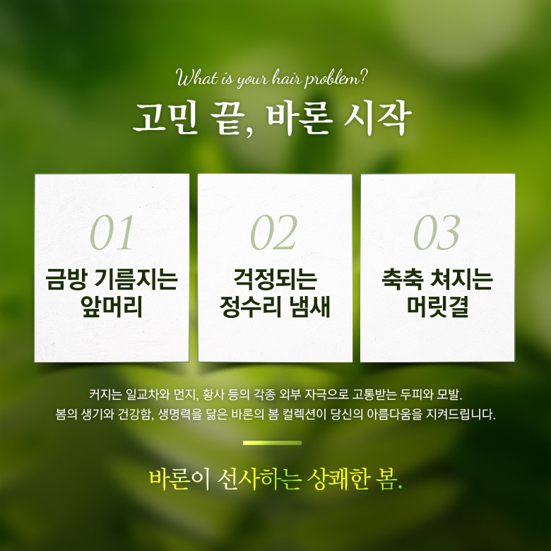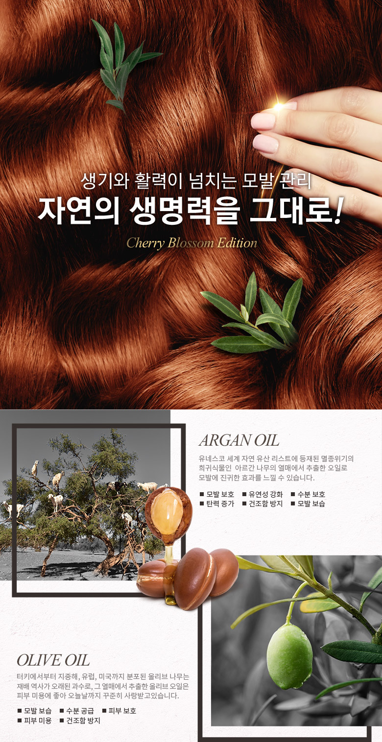 | 화장품법에 따라 기재/ 표시하여야 하는 모든 성분 | 체리블라썸 샴푸 : 정제수, 다이소듐라우레스설포석시네이트, 코카미도프로필베타인, 코코-글루코사이드, 글리세린, 데실글루코사이드, 솔비톨, 소듐코코일이세티오네이트, 글리세레스-26, 드럼스틱잎추출물(5,000ppm), 왕벚나무꽃추출물(5,000ppm), 동백나무씨오일, 올리브오일, 아르간커넬오일, 하이드롤라이즈드실크, 하이드롤라이즈드콜라겐, 하이드롤라이즈드케라틴, 다윈튤립꽃추출물, 모란꽃수, 동백나무꽃추출물, 프로방스장미꽃추출물, 데이지꽃추출물, 봉선화꽃추출물, 금낭화꽃추출물, 복사나무꽃추출물, 와일드제라늄추출물, 채송화추출물, 개양귀비꽃추출물, 폴리쿼터늄-10, 시트릭애씨드, 폴리쿼터늄-11, 코카마이드메틸엠이에이, 피이지-120메틸글루코스디올리에이트, 라우릴다이에틸렌다이아미노글라이신, 트레할로오스, 에틸헥실글리세린, 메틸프로판다이올, 부틸렌글라이콜, 1,2-헥산다이올, 소듐클로라이드, 소듐벤조에이트, 다이소듐이디티에이, 향료, 부틸페닐메틸프로피오날, 헥실신남알, 벤질살리실레이트, 알파-아이소메틸아이오논체리블라썸 트리트먼트 : 정제수, 세테아릴알코올, 사이클로펜타실록세인, 아모다이메티콘, 솔비톨, 스테아라미도프로필다이메틸아민, 세틸알코올, 베헨트라이모늄메토설페이트, 다이팔미토일에틸다이모늄클로라이드, 다이메티콘올, 에틸헥실팔미테이트, 다이메티콘, 드럼스틱잎추출물(5,000ppm), 왕벚나무꽃추출물(5,000ppm), 동백나무씨오일, 올리브오일, 아르간커넬오일, 판테놀, 하이드롤라이즈드실크, 하이드롤라이즈드콜라겐, 하이드롤라이즈드케라틴, 다윈튤립꽃추출물, 모란꽃수, 동백나무꽃추출물, 프로방스장미꽃추출물, 데이지꽃추출물, 봉선화꽃추출물, 금낭화꽃추출물, 복사나무꽃추출물, 와일드제라늄추출물, 채송화추출물, 개양귀비꽃추출물, 글리세린, 토코페릴아세테이트, 부틸렌글라이콜, 메틸프로판다이올, 라우릴피리디늄클로라이드, 라우릴다이에틸렌다이아미노글라이신, 피씨에이에틸코코일알지네이트, 1,2-헥산다이올, 글라이콜릭애씨드, 향료, 부틸페닐메틸프로피오날, 헥실신남알, 벤질살리실레이트, 알파-아이소메틸아이오논 |