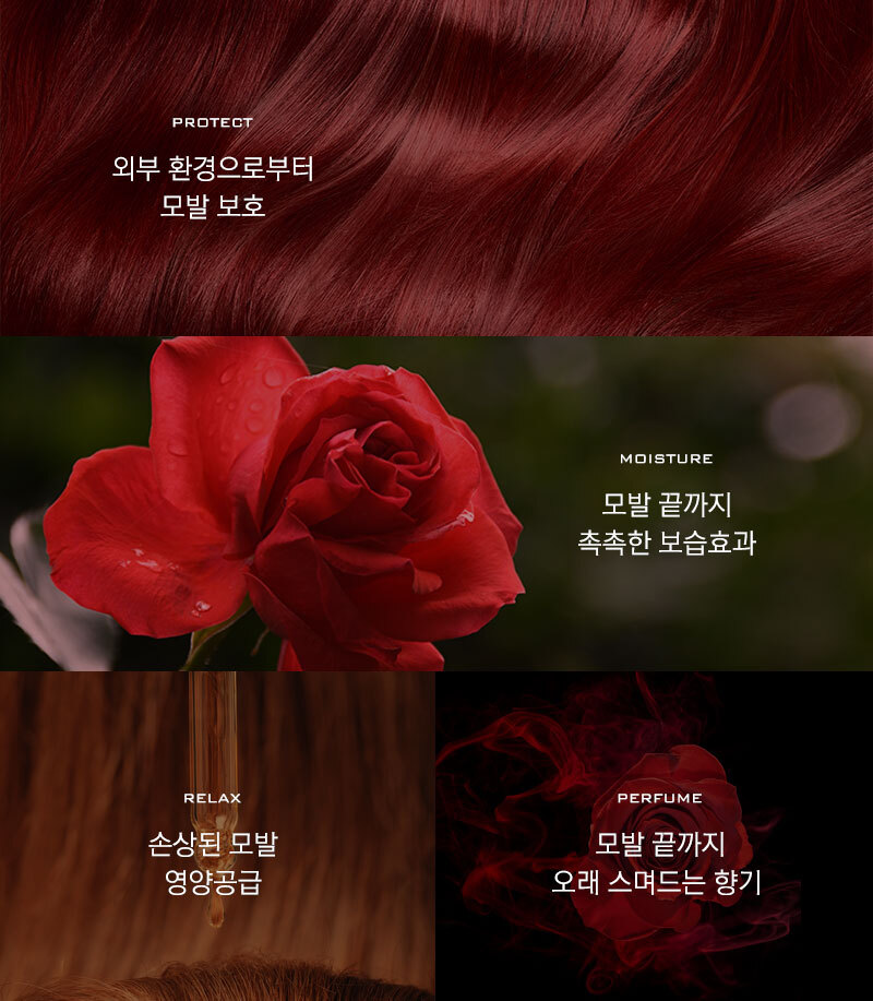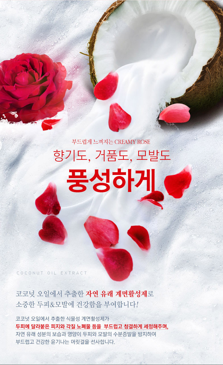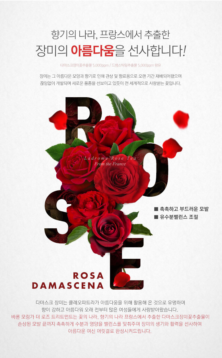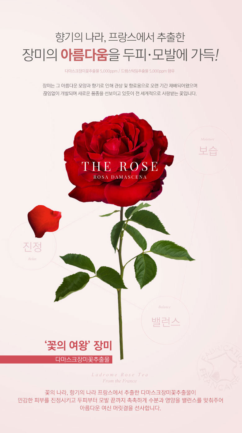 | 화장품법에 따라 기재/ 표시하여야 하는 모든 성분 | 더 로즈 샴푸 : 정제수, 다이소듐라우레스설포석시네이트, 코카미도프로필베타인, 코코-글루코사이드, 글리세린, 데실글루코사이드, 솔비톨, 소듐코코일이세티오네이트, 글리세레스-26, 드럼스틱잎추출물(5,000ppm), 다마스크장미꽃추출물(5,000ppm), 로즈힙열매오일, 올리브오일, 아르간커넬오일, 하이드롤라이즈드실크, 하이드롤라이즈드콜라겐, 하이드롤라이즈드케라틴, 다윈튤립꽃추출물, 모란꽃수, 동백나무꽃추출물, 프로방스장미꽃추출물, 데이지꽃추출물, 봉선화꽃추출물, 금낭화꽃추출물, 복사나무꽃추출물, 와일드제라늄추출물, 채송화추출물, 개양귀비꽃추출물, 폴리쿼터늄-10, 시트릭애씨드, 폴리쿼터늄-11, 코카마이드메틸엠이에이, 피이지-120메틸글루코스디올리에이트, 라우릴다이에틸렌다이아미노글라이신, 트레할로오스, 에틸헥실글리세린, 메틸프로판다이올, 부틸렌글라이콜, 1,2-헥산다이올, 소듐클로라이드, 소듐벤조에이트, 다이소듐이디티에이, 향료, 벤질살리실레이트, 벤질벤조에이트, 리날룰, 부틸페닐메틸프로피오날, 제라니올, 헥실신남알더 로즈 트리트먼트 : 정제수, 세테아릴알코올, 사이클로펜타실록세인, 아모다이메티콘, 솔비톨, 스테아라미도프로필다이메틸아민, 세틸알코올, 베헨트라이모늄메토설페이트, 다이팔미토일에틸다이모늄클로라이드, 다이메티콘올, 에틸헥실팔미테이트, 다이메티콘, 드럼스틱잎추출물(5,000ppm), 다마스크장미꽃추출물(5,000ppm), 로즈힙열매오일, 올리브오일, 아르간커넬오일, 판테놀, 하이드롤라이즈드실크, 하이드롤라이즈드콜라겐, 하이드롤라이즈드케라틴, 프로방스장미꽃추출물, 다윈튤립꽃추출물, 모란꽃수, 동백나무꽃추출물, 데이지꽃추출물, 봉선화꽃추출물, 금낭화꽃추출물, 복사나무꽃추출물, 와일드제라늄추출물, 채송화추출물, 개양귀비꽃추출물, 글리세린, 토코페릴아세테이트, 부틸렌글라이콜, 메틸프로판다이올, 라우릴피리디늄클로라이드, 라우릴다이에틸렌다이아미노글라이신, 피씨에이에틸코코일알지네이트, 1,2-헥산다이올, 글라이콜릭애씨드, 향료, 벤질살리실레이트, 벤질벤조에이트, 리날룰, 부틸페닐메틸프로피오날, 제라니올, 헥실신남알 |
