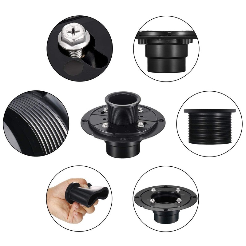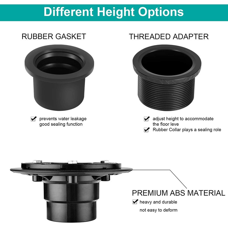 - MATERIAL: Threaded joints and shower drain base are made of 100% high-density ABS materials, the strength of tensile is high, and not easy to deform and fragment. High elastic rubber joints can be wrapped tightly with the drains to prevent slipping and leakage. The screw is the use of high-quality stainless steel and high hardness to avoid deform, rust, and corrosion