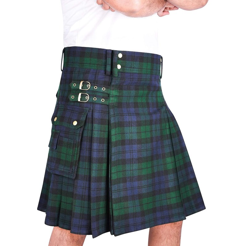 BaronHong Tartan Utility Kilts for Men Tartan Kilt with Straps and Large Cargo Pockets, Green