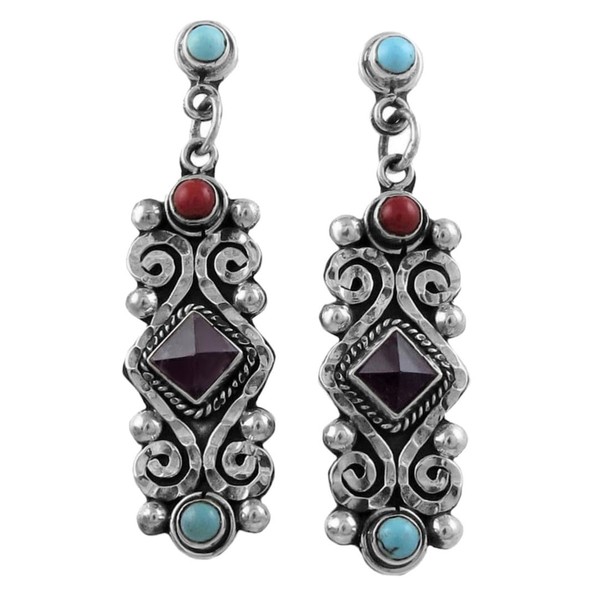 Handmade with reverence for tradition and artistry, these striking earrings are inspired by the opulent Renaissance designs of Matilda "Matl" Poulat. Rich in Baroque detail, they feature ornate scrollwork in polished and blackened silver tones, embellished with vibrant turquoise and coral inlays that bring colour and character to every curve. At the centre, amethyst gemstones add a touch of royal elegance. Known as the stone of peace, protection, and spiritual clarity, amethyst deepens the emotional meaning behind the design, making these earrings as symbolic as they are beautiful. A true statement of style and soul—complete the look with the matching ring in this bold, expressive collection.