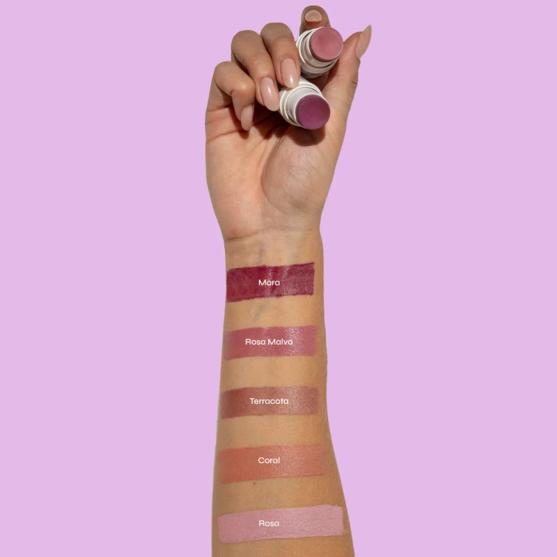 - Rubor: Desliza la barra directamente sobre las manzanas de tus mejillas y difumina suavemente con los dedos o una brocha para un acabado natural.