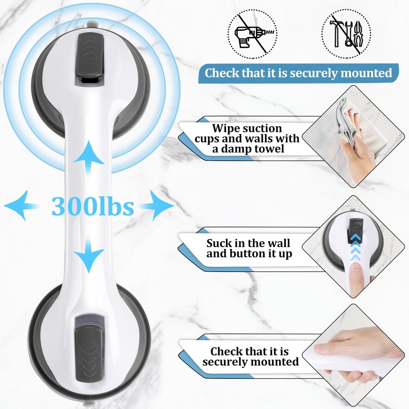 - Fácil instalación y extracción: asegúrate de que la superficie esté limpia y seca antes de la instalación. Estas asas de ducha para succión de personas mayores están diseñadas para una fácil instalación y extracción, simplemente gira los pestillos de bloqueo para asegurar la barra de agarre de la ducha en su lugar.