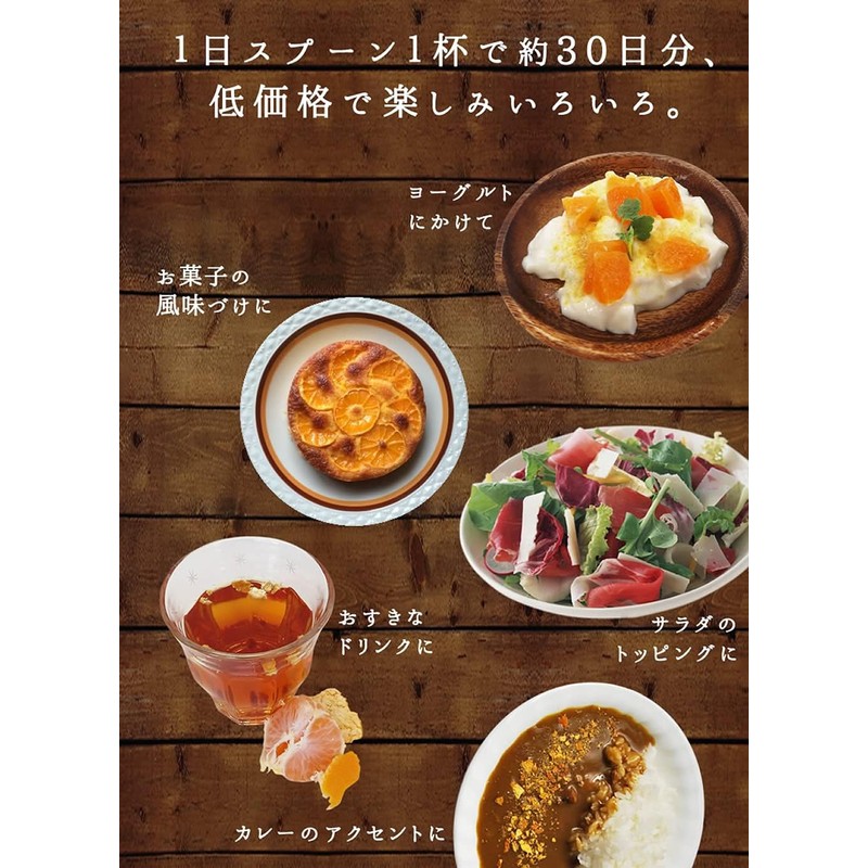 • Wenzhou mandarin peel carefully and carefully dried. When placed in a bran bed, the light citrus scent will improve the flavor. Because it is powder formed, it is easy to use, and it can also be used as condiments for yogurt and tempura