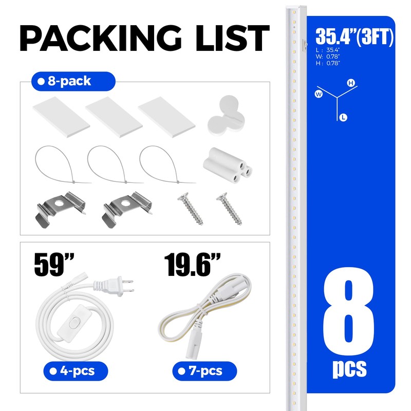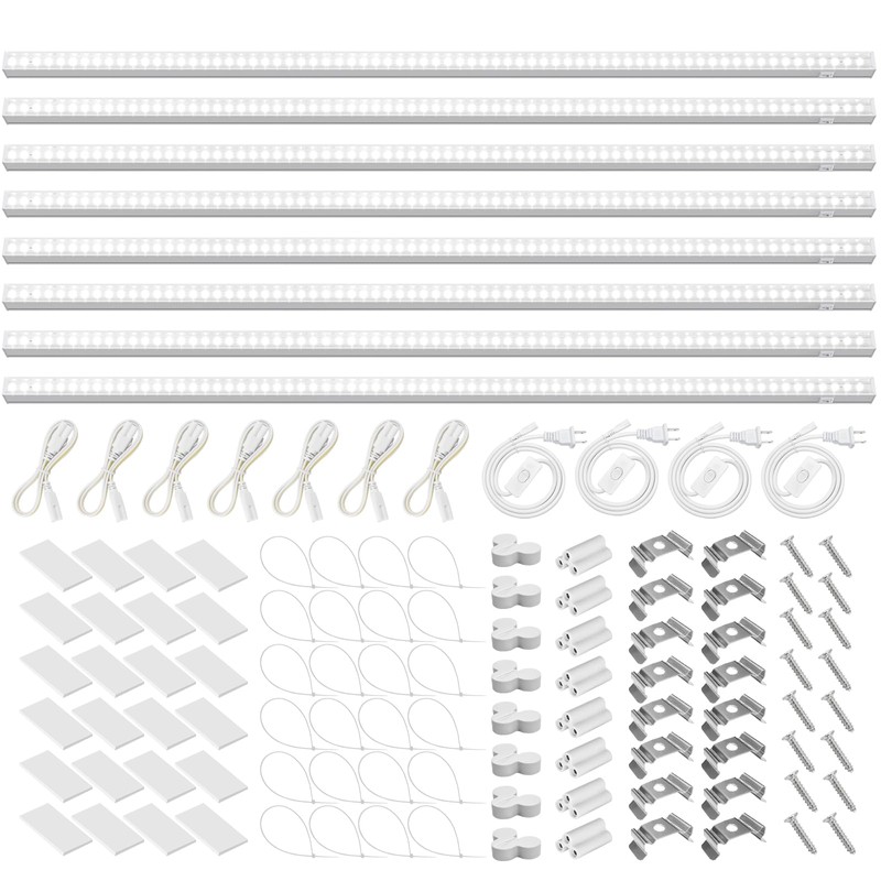 - What You Get: 8 x Barrina T5 Grow Lights, 4 x Power Cords with ON/OFF Switch, 7 x Connecting Cords (20''), 8 x Small Connectors, 16 x Installation Clips, 16 x Double-sided Tapes, 24 x Cable Ties, 8 x Dustproof Cap