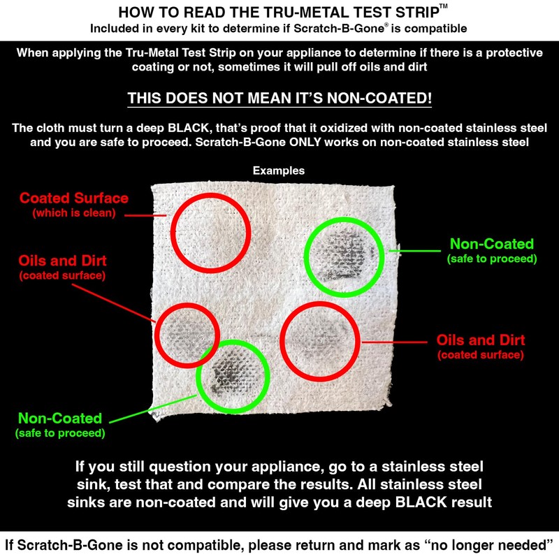 - Your First Aid Kit for Stainless Steel! Works on all non-coated brushed or satin stainless steel (not for use on mirror finish) WARNING, most appliance handles are NOT stainless steel. Always test surface you're working on with the Tru-Metal Test Strip included in every kit before proceeding AND ALWAYS work in the grain direction as straight as possible