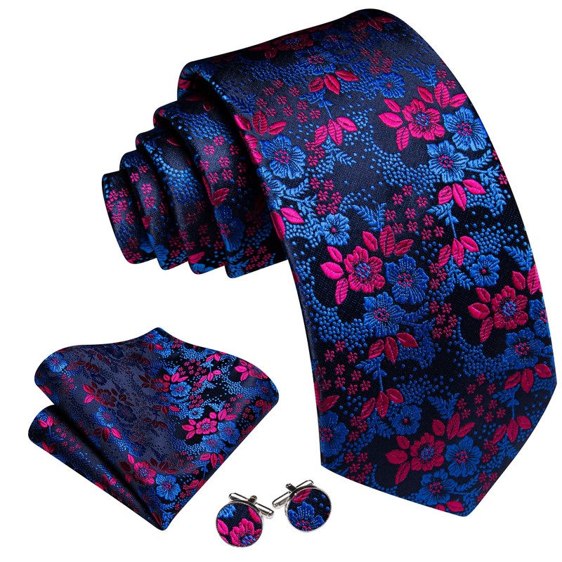 Barry.Wang Blue Red Tie with Flower Lapel Pin for Men Floral Silk Necktie Pocket Square Cufflinks Set Formal Wedding Party Business