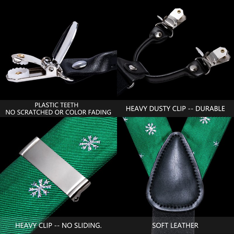 Barry.Wang Men Paisley Suspender and Bow Tie Set with Floral Pocket Square Y Shape 6 Clips Braces, Green Xmas Snowflake, One Size
