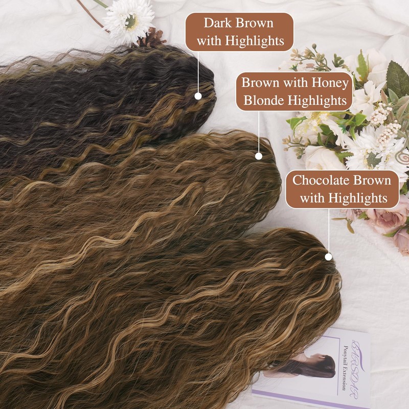 BARSDAR Brown Highlights Long Curly Wavy Drawstring Ponytail Extensions – 30 Inch Synthetic Comb Clip in Ponytails Hairpieces for Women, Voluminous Natural Looking Bohemian Ponytail Extension