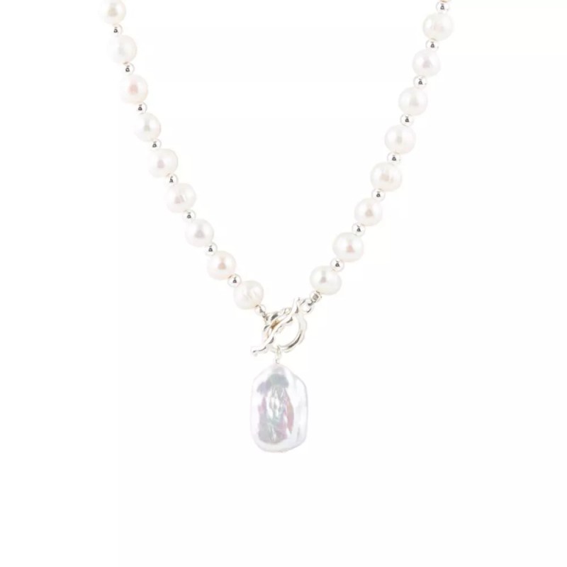 This unique Sunday Best Pearl Toggle Necklace is a perfect accessory for any special occasion. It features genuine freshwater pearls and sterling silver, expertly crafted by hand and finished with a beautiful toggle closure. Wear it at 18" length for an elegant statement, or add the .9" x .6" pendant for extra shine. With its dazzling white and silver colors, it adds just the right touch of sophistication. 1.2 oz of stunning beauty.Sunday Best Pearl Toggle Necklace
