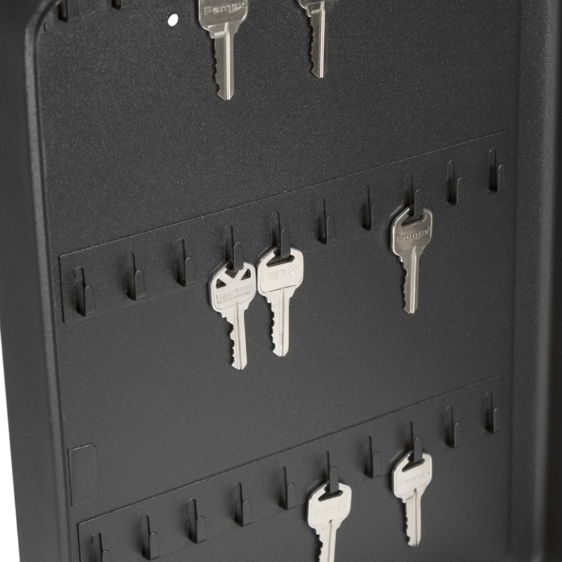 Keep up to 57 keys organized and secure in this key cabinet. Equipped with a pin code lock, which can be changed when needed. Convenient turn knob to open cabinet. A continuous piano hinge allows the door to be in line with the cabinet to have a full view of all the keys. Four pre-drilled holes and mounting hardware included for easy installation.