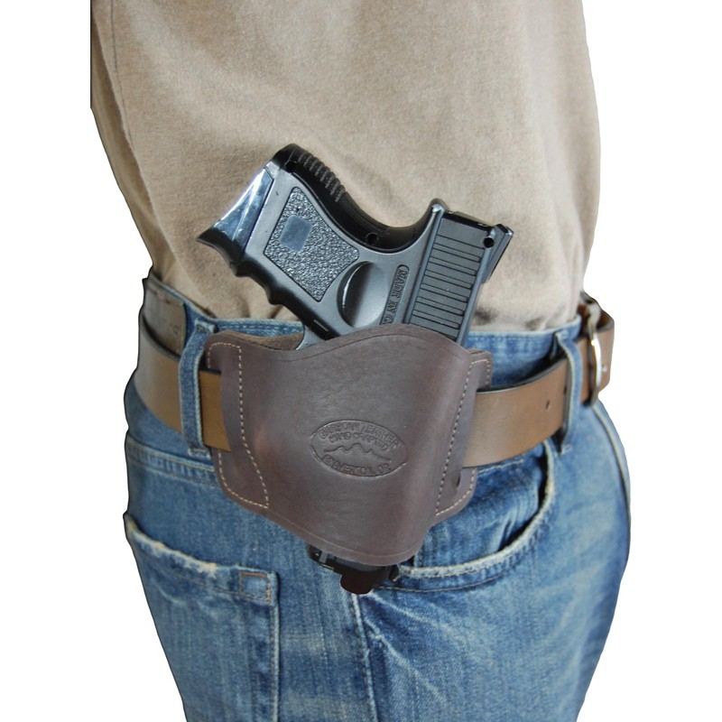 - Barsony New Quick Slide Gun OWB Brown Leather Holster is compatible with gun make/model sizes listed in the drop down menu.