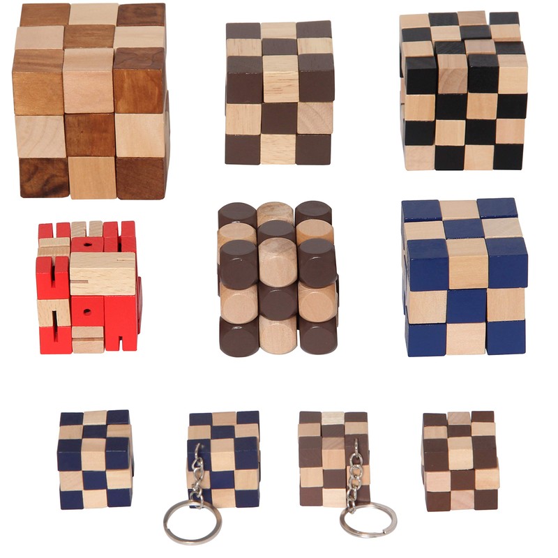 Its individual cubes are linked together by a string so that the individual parts cannot be lost.