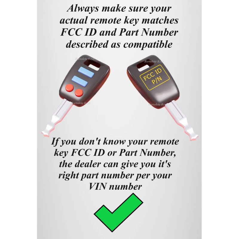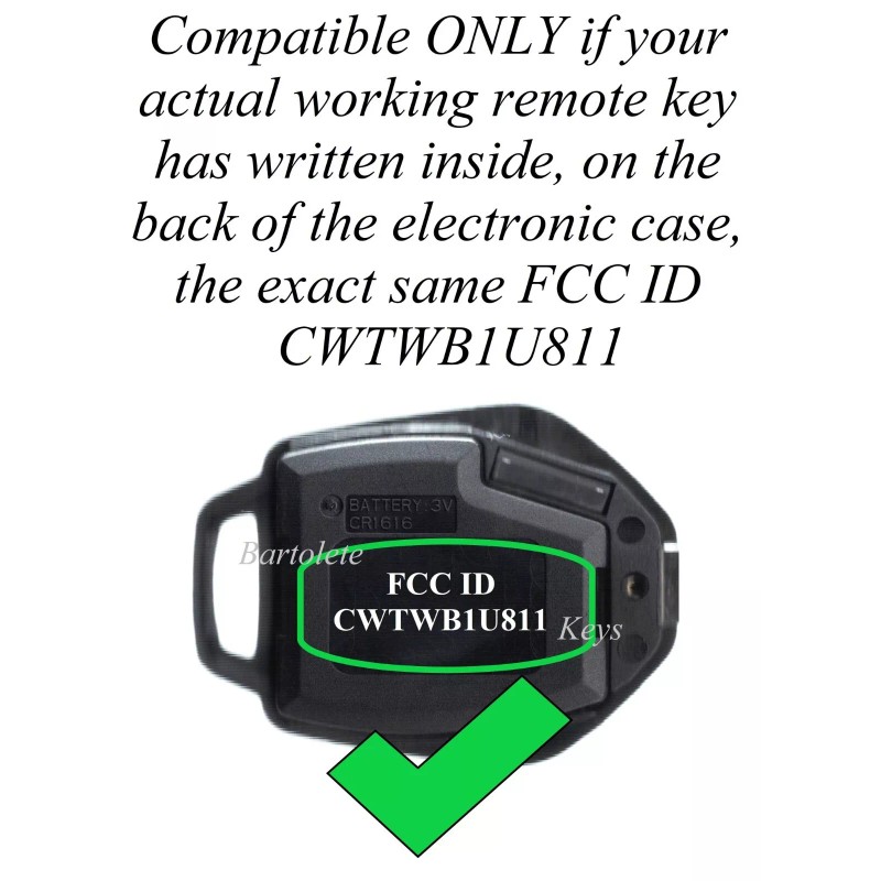 WARNING: This item is compatible with your vehicle, ONLY if your actual working remote key looks exactly the same as the photo shows, an integrated transponder key with the remote functions on the key's head, it has the same buttons and functions, it has written on the back of the electronic case (Just open your remote and you'll see it on the back of the inside electronic case) the exact same FCC ID "CWTWB1U811" and your car has a regular ignition lock (Not for push start button or turning knob ignition models).